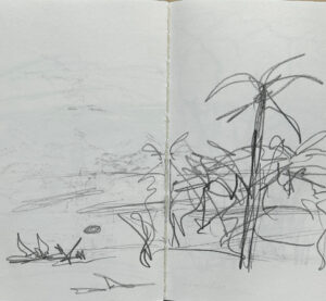 After the workshop, I did some sketching on my own. I made some super-fast pencil sketches of the beach and palm trees while standing and walking. The goal was to capture the feel of my surroundings without depicting the exact scene or worrying about perspective, proportions, or details.