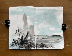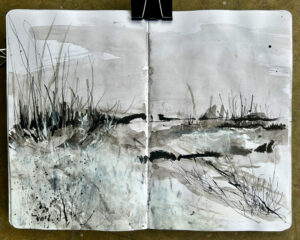 Outside of class, I spent time outdoors creating plain air landscape sketches with ink wash, Art Graf, and graphite. After the ink dried, I colored over the areas I didn’t like with pastel.