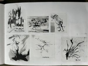 It was interesting to watch my work evolve over the course of the week. At first my sketches were far too literal, but, as time passed, I was able to simplify more and more.